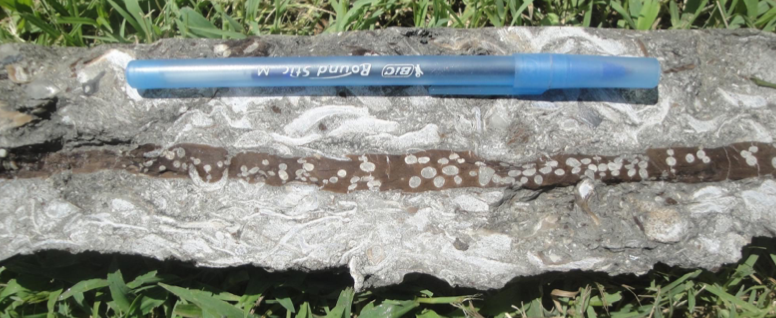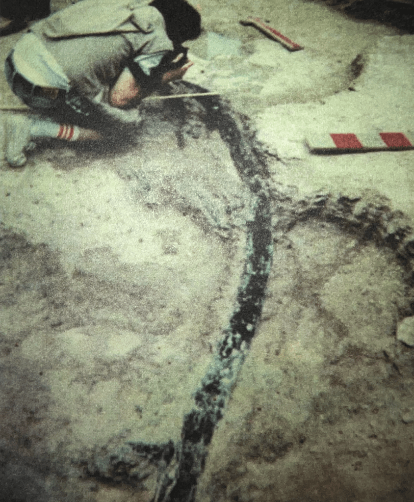 Carl Baugh never published any professional or technical reports of his work in the scientific literature. The best source that comes the closest to a pro-anomalistic technical treatment of the claimed Paluxy anachronisms is Helfinstine and Roth’s 2007 report Texas Tracks and Artifacts. They note that in 1987 a “coalified” Lepidodendron root was recovered by Baugh and his team in June of that year at a western excavation area of the McFall site.8 This branch was claimed to be “polystrate”, being found in a marl layer and extending into an upper and lower limestone layer – thus the fossil was not only supposedly out-of-place, but also shows a peculiar formation of limestone, given that all three layers would have to be deposited rapidly to encase the branch. (p. 29-31) However, the authors don’t provide any documentaiton for this find – they provide a drawing of what they say the root looked like in situ, (p. 31) but do not specify how they identified the layers as limestone or to what extent the marl was lithified. “Marl” can often refer to a loose, unconsolidated sedimentary soil that is composed of clay and lime – it is loose, crumbly, and earthy, with a consistency similar to thick mud or silty clay. (Donovan & Pickerill, 2013; Karrow, 2010) It can form in rivers where limestone is present (like the Paluxy) due to calcium leaching, can incorporate modern organisms, and can vary in lithification based on moisture and compactness, mimicking limestone and marlstone that were deposited millions of years ago. A photograph provided by Baugh in his 1989 dissertation (p. 366) seems to suggest that this misidentification may have taken place. (Fig.5)